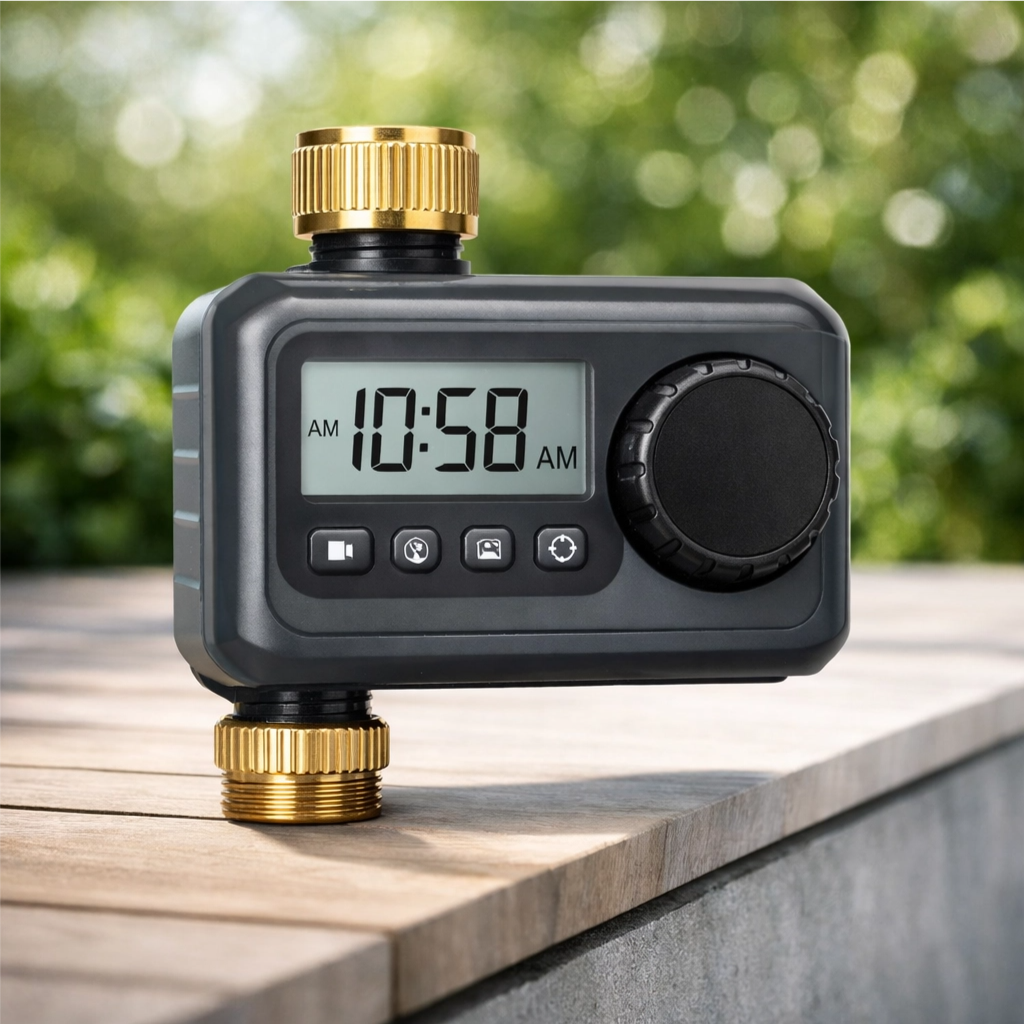 The timer operates using batteries, making it fully wireless and easy to install outdoors.